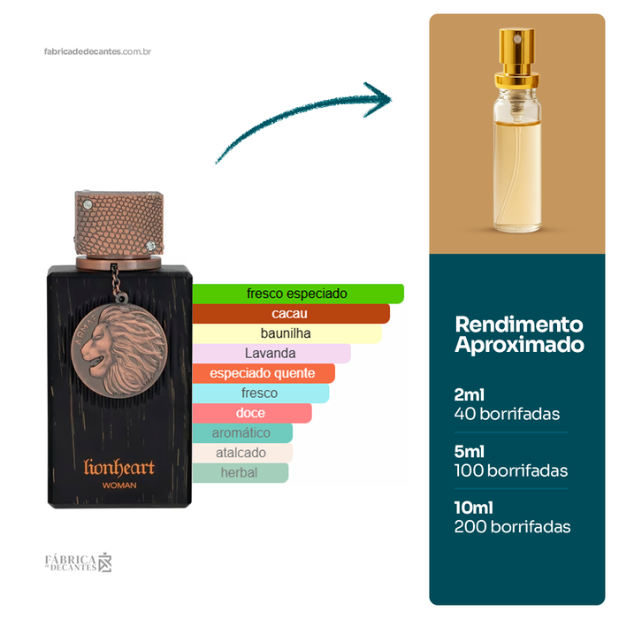 Club De Nuit Lionheart Woman de Armaf é um perfume Oriental Baunilha Feminino. Esta é uma nova fragrância. Club De Nuit Lionheart Woman foi lançado em 2025. As notas de...