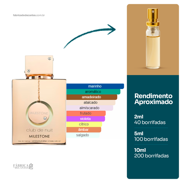 Club de Nuit Milestone de Armaf é um perfume Amadeirado Floral Almiscarado Compartilhável. Club de Nuit Milestone foi lançado em 2019. As notas de topo são: Notas Oceânicas, Frutas Vermelhas...