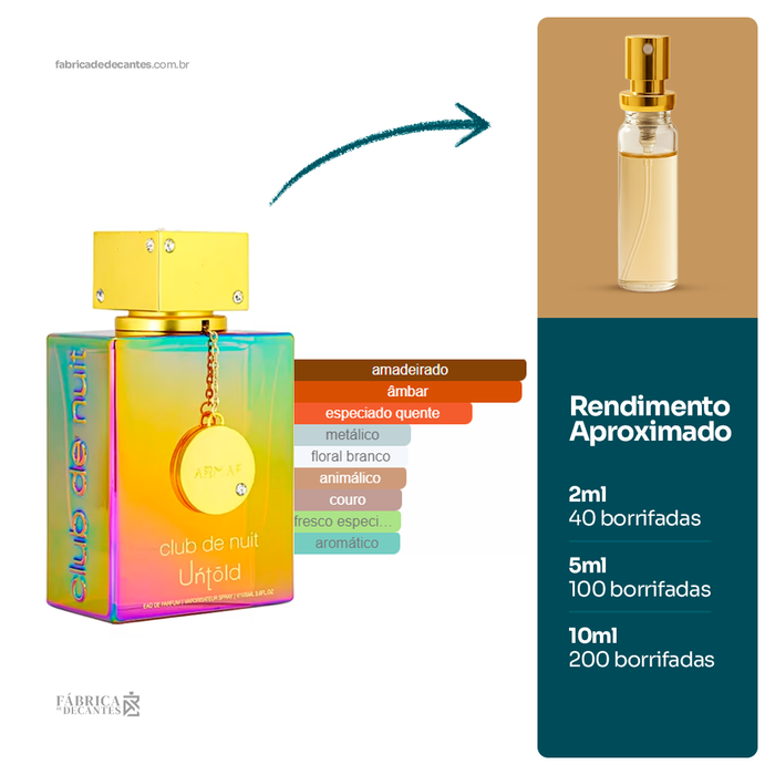 Club de Nuit Untold de Armaf é um perfume Compartilhável. Club de Nuit Untold foi lançado em 2022. As notas de topo são: Açafrão e Jasmim. As notas de coração...