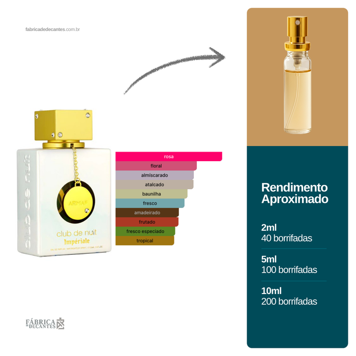 Club de Nuit White Imperiale de Armaf é um perfume Feminino. Club de Nuit White Imperiale foi lançado em 2022. As notas de topo são: Lichia, Bergamota e Noz-moscada. As notas de coração são: Rosa...