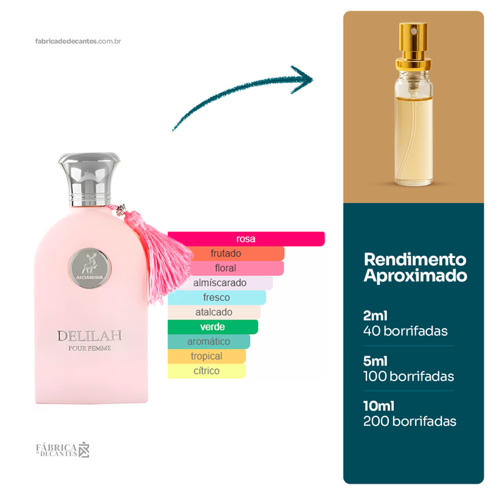 Delilah de Maison Alhambra é um perfume Floral Frutado Feminino. Delilah foi lançado em 2023. As notas de topo são: Ruibarbo, Lichia e Bergamota. As notas de coração são: Rosa...