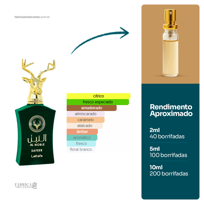 Safeer de Lattafa Perfumes é um perfume Compartilhável. As notas de topo são: Toranja, Bergamota, Gengibre e Pimenta Preta. As notas de coração são: Caramelo, Jasmim e Heliotrópio. As notas...