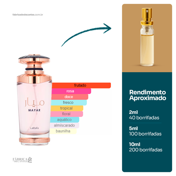 Mayar de Lattafa Perfumes é um perfume Floral Frutado Feminino. Mayar foi lançado em 2022. As notas de topo são: Lichia, Framboesa e Folha de Violeta. As notas de coração...