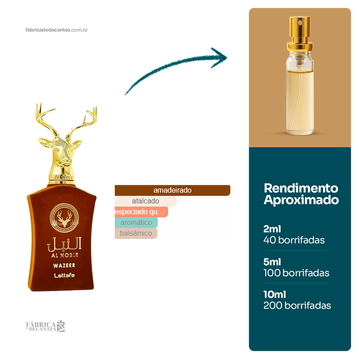 Wazeer de Lattafa Perfumes é um perfume Compartilhável. As notas de topo são: Conhaque, Maçã, Noz-moscada e Açafrão. As notas de coração são: Cedro, Sândalo, Whiskey e Carvalho. As notas...