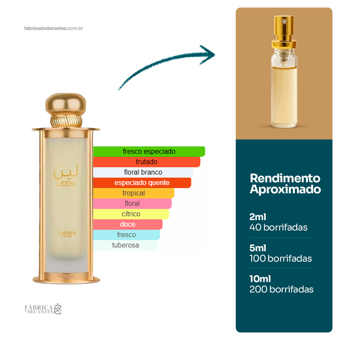 Leen de Lattafa Perfumes é um perfume Oriental Floral Compartilhável. Leen foi lançado em 2023. As notas de topo são: Gengibre, Curcuma, Bergamota e Pimenta Rosa. As notas de coração...