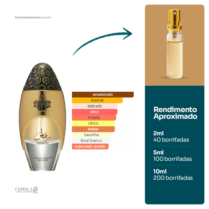Remas de Lattafa Perfumes é um perfume Floral Amadeirado Almiscarado Compartilhável. As notas de topo são: Manga, Bergamota e Laranja. As notas de coração são: Sândalo e Jasmim. As notas...