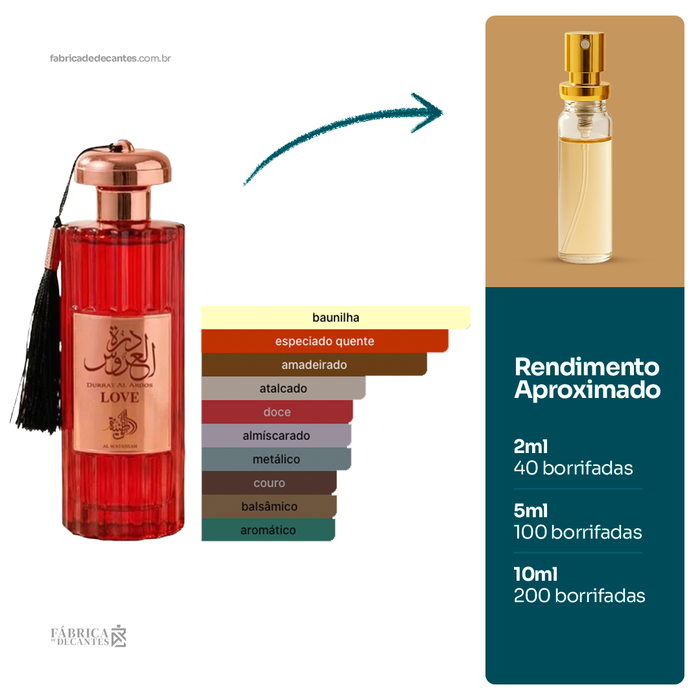 Durrat Al Aroos Love de Al Wataniah é um perfume Oriental Especiado Feminino. Esta é uma nova fragrância. Durrat Al Aroos Love foi lançado em 2025. As notas de topo...