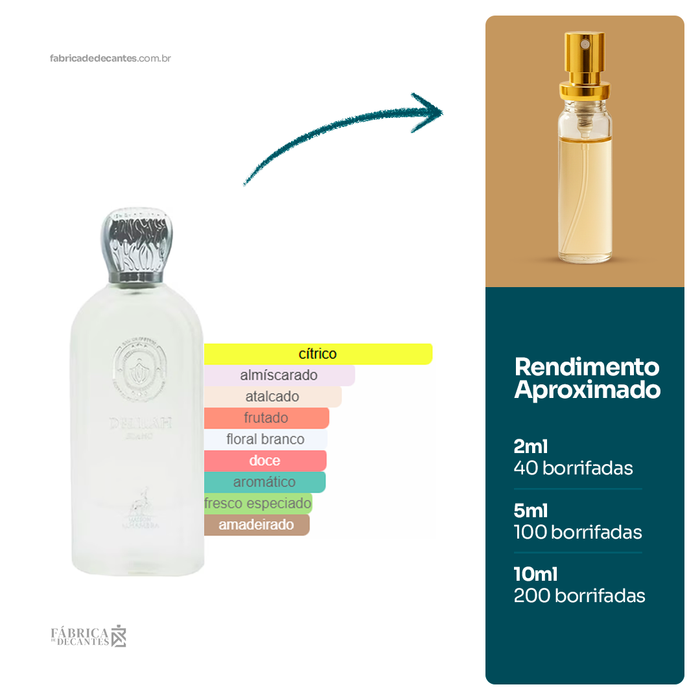 Delilah Blanc de Maison Alhambra é um perfume Floral Frutado Feminino. Delilah Blanc foi lançado em 2024. As notas de topo são: Bergamota, Pêssego Branco e Mandarina. As notas de...