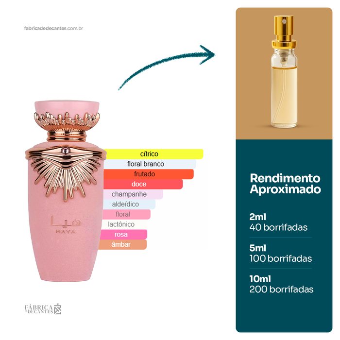 Haya de Lattafa Perfumes é um perfume Feminino. Haya foi lançado em 2022. As notas de topo são: Morango, Champanhe, Tangerina, Laranja Sanguínea e Rosa. As notas de coração são:...
