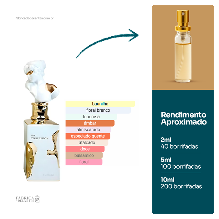 Her Confession de Lattafa Perfumes é um perfume Feminino. Esta é uma nova fragrância. Her Confession foi lançado em 2024. As notas de topo são: Canela e Mystikal. As notas...