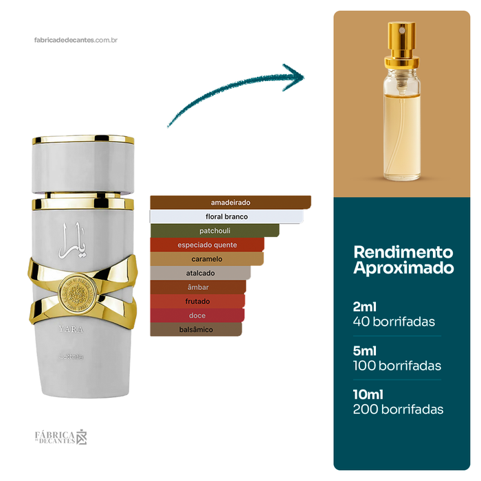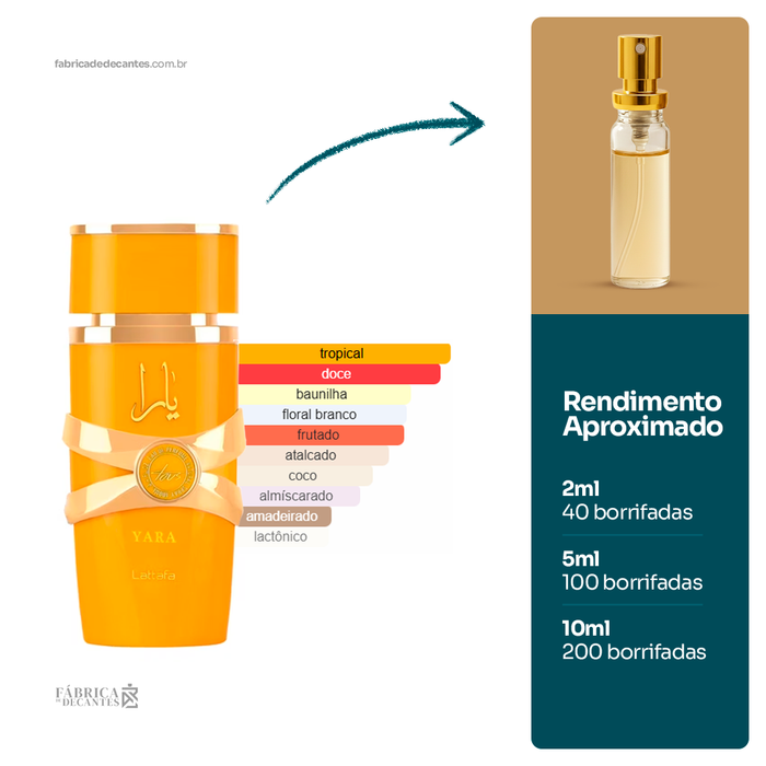 Yara Tous de Lattafa Perfumes é um perfume Feminino. Yara Tous foi lançado em 2023. As notas de topo são: Manga, Coco e Maracujá. As notas de coração são: Jasmim,...